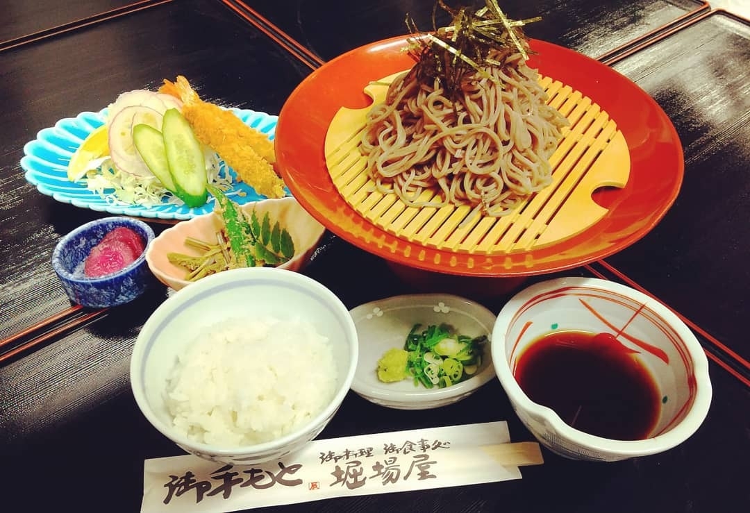 (ざるそば、フライ、小鉢、香物、ごはん)