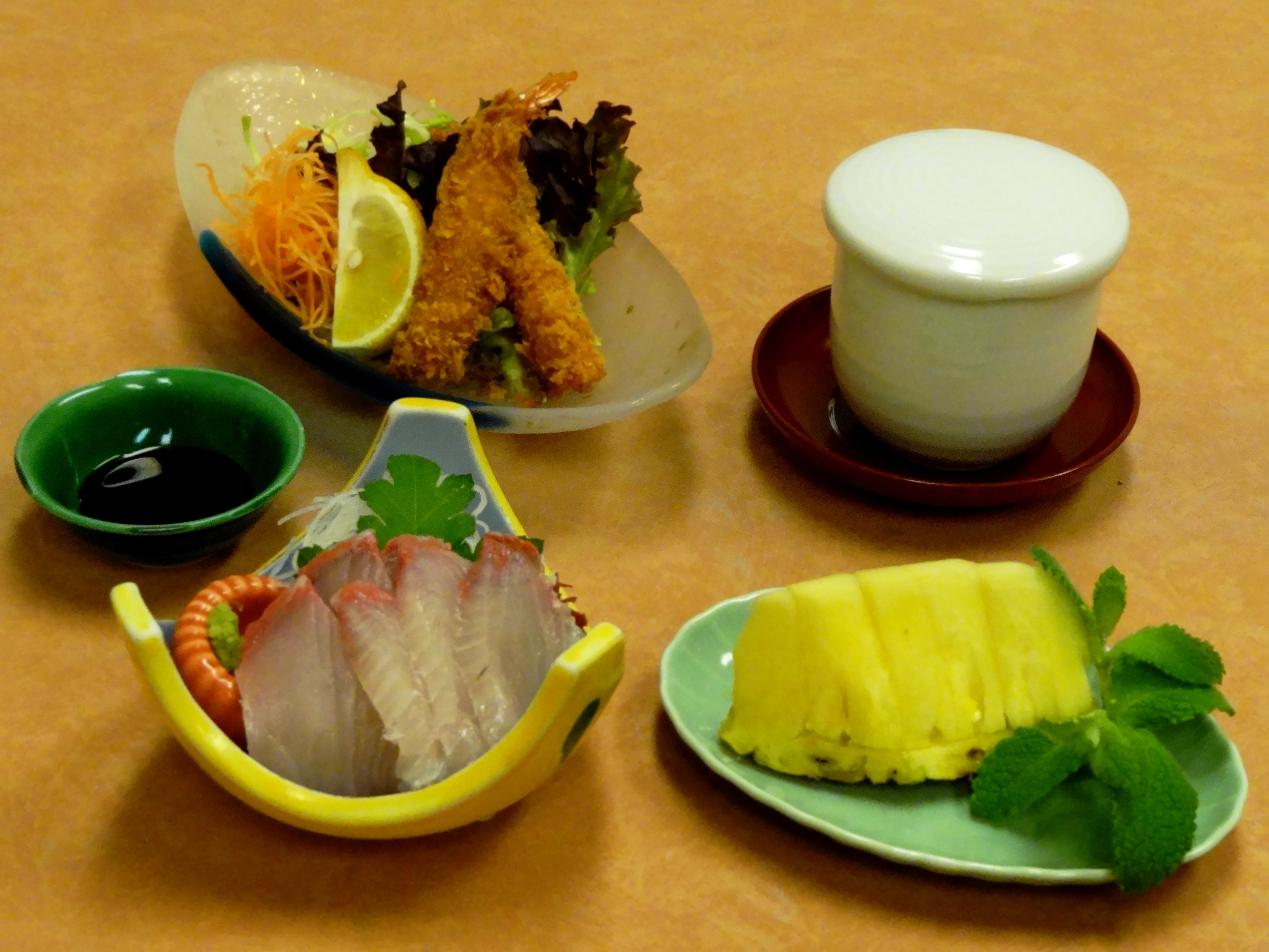 ・先付 ・お造り(二種盛) ・揚げ物 ・蒸し物 ・焼き物 ・御飯 ・赤だし ・香の物